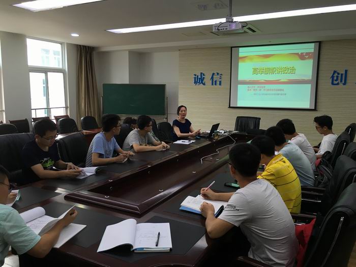 戴宏老师以“高举旗帜讲政治”为题为大家作了推进“两学一做”学习教育常态化制度化的党课辅导,她强调了“两学一做”学习教育常态化制度化的重要意义,并就学习教育活动的目标要求、学习方案、制度措施、具体工作进行了讲解和部署。她强调一定要深刻领会“两学一做”学习教育常态化制度化的重要性,将“两学一做”融入到支部平时活动中来,发挥党支部堡垒作用,发挥党员先锋模范作用,争当“六个先锋”,争做“四个先行”,以优异成绩迎接党的十九大胜利召开。随后,戴宏老师还就庆祝建党九十六周年、毕业生党组织关系转接、党费收缴等工作进行了部署。