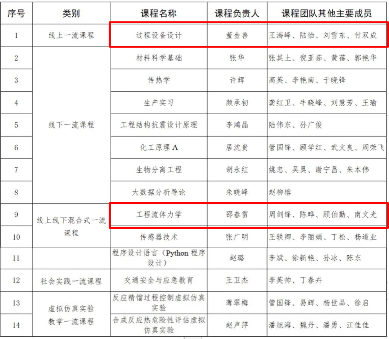 由董金善团队主讲的《过程设备设计》被认定为线上一流课程,由邵春雷团队主讲的《工程流体力学》被认定为线上线下混合式一流课程。董金善团队和邵春雷团队致力于线上课程建设以及混合式教学实践研究,投入大量时间和精力,践行课程思政、重视过程评价、线上线下融合,建设成效和示范作用显著。