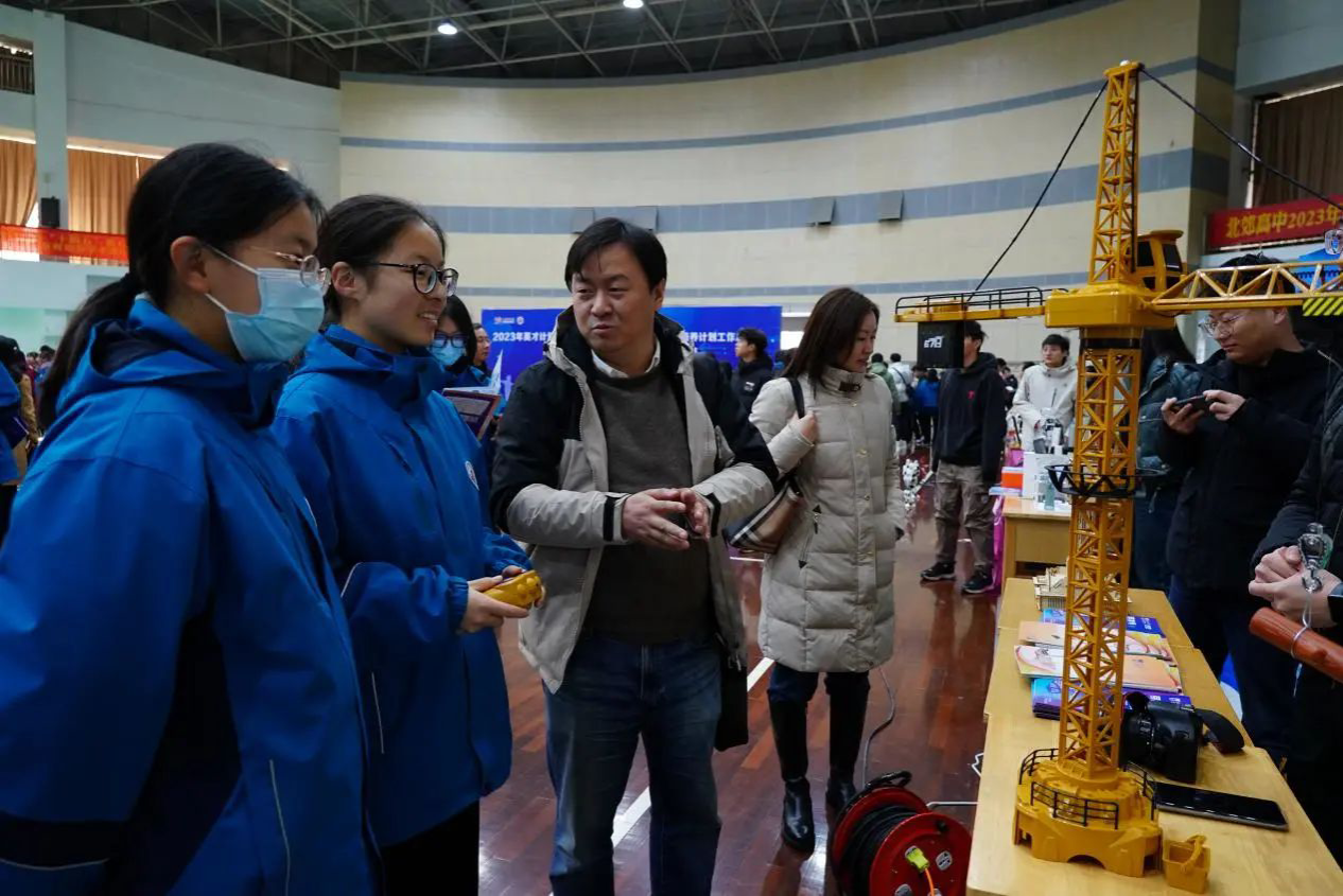 开幕式结束后,公司一行来到了展示活动区,和现场的师生进行热情交流,并结合电动遥控塔吊,为现场参加活动的高中生带来了一堂生动形象的科普体验课。