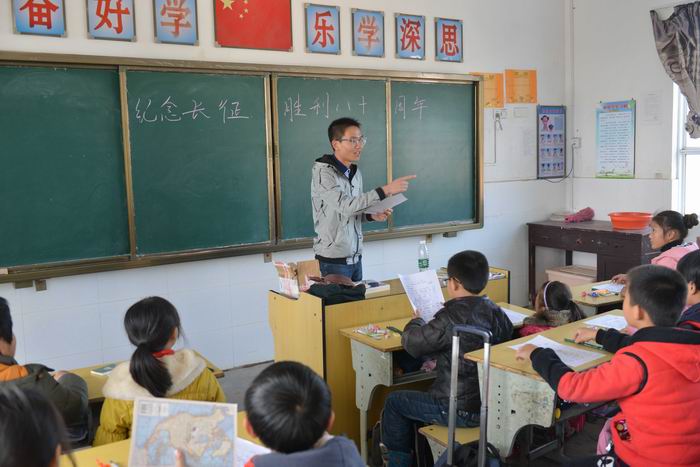 11月10日中午,阳光明媚,全体成员乘坐大巴共赴安徽。到了金城小学之后,所有的孩子和老员工党员分成两个班,分别教导孩子们学习了《红星歌》和《长江之歌》,并讲述了一些生动有趣的爱国小故事,以孩子们容易接受的方式培养他们的爱国情怀。“你从雪山走来春潮是你的丰采;你向东海奔去,惊涛是你的气概。你用甘甜的乳汁,哺育各族儿女;你用健美的臂膀,挽起高山大海。”这首朗朗上口的《长江之歌》不时从安徽金城小学的课堂传出。教小员工们《长江之歌》的志愿者徐晓舟同学介绍说:“这首歌虽然旋律激昂,情感充沛,但词语很是优美,赞美了祖国的大好河山,可以让小朋友们在学习的过程中感受到祖国的美丽,有助于培养他们的爱国情怀。”
