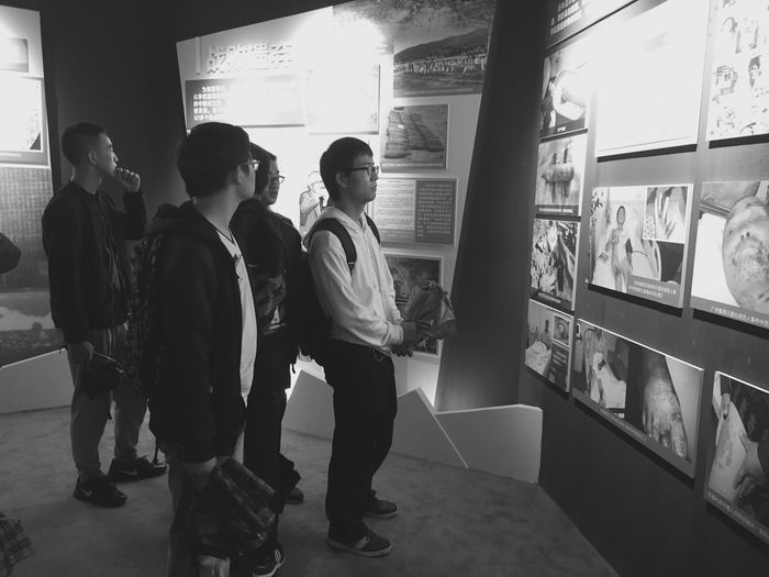 当我们站在了纪念馆的门口,原先路上有欢有笑的心情都忽然不翼而飞,剩下的只有满脸的肃穆、满眼的苍凉,似乎那口和平之钟的巨大回响在无情地震撼着我们的心,警示着人们珍惜如今这来之不易的和平。沉闷,压抑是主旋律,史料陈列馆呈平顶半地下墓室形,看着不高。进去后先要经过一处厅堂,幽暗的灯光就像发自地狱; 往里,一堵突兀的墙映入眼帘,仅可考的遇难者名单密密麻麻的写满了一堵墙!一个个鲜活的无辜生命,人们却只能用这种方式纪念他们--日军的暴行令人发指。12秒纪念点、万人坑……满满2个小时的震撼之旅同学们的脚步是沉重的,他们在思索,在成长。