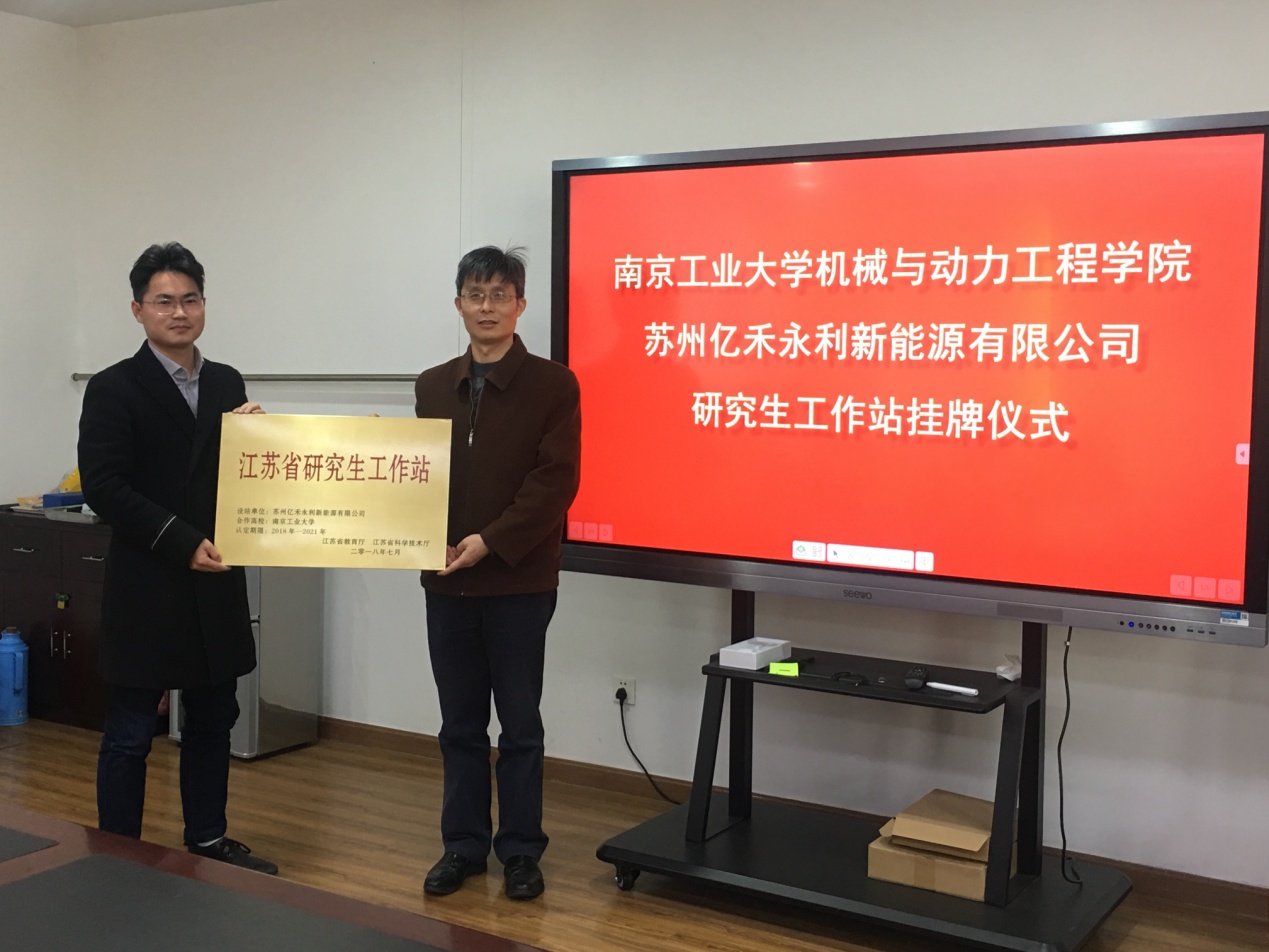 太阳成城集团tyc234cc古天乐—苏州亿禾永利新能源有限公司“江苏省研究生工作站”挂牌仪式于2019年11月29日举行,苏州亿禾永利新能源有限公司总经理章海峡,太阳成城集团tyc234cc古天乐经理赵建平教授,副经理彭浩教授,校内合作导师和进站员工参加了挂牌仪式。