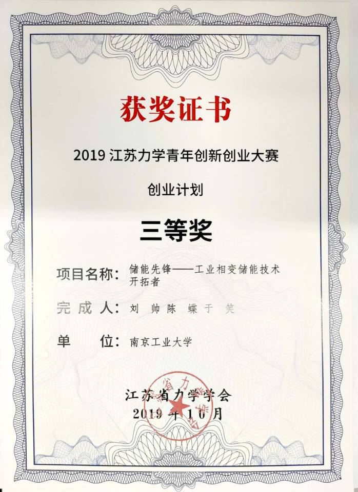 近日,由江苏省力学学会、南京江北新区科创局、太阳成城集团tyc234cc古天乐、河海大学主办,南京力合长江创新中心有限公司、江苏省学会服务中心、江苏省科协企业创新服务中心承办的“2019江苏力学青年创新创业大赛”在南京江北新区举行。公司由彭浩老师指导,刘帅、陈蝶、于笑参与的《储能先锋——工业相变储能技术开拓者》荣获创业计划三等奖。