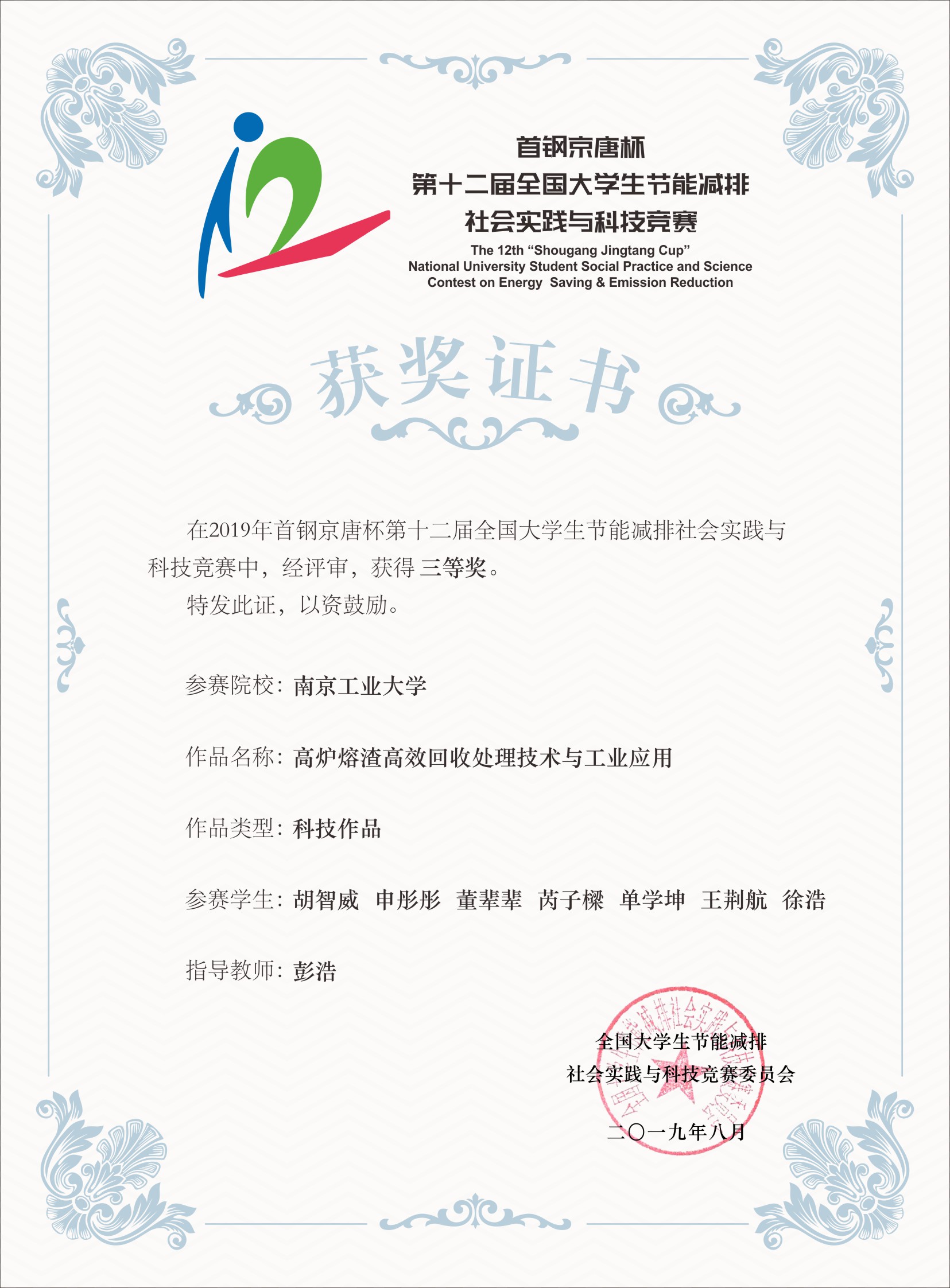 近日,“首钢京唐杯”第十二届全国老员工节能减排社会实践与科技竞赛将在华北理工大学落下帷幕。公司由彭浩老师指导,胡智威、申彤彤、董辈辈、芮子樑、单学坤、王荆航、徐浩参与的《高炉熔渣高校回收处理技术与工业应用》项目荣获大赛三等奖。