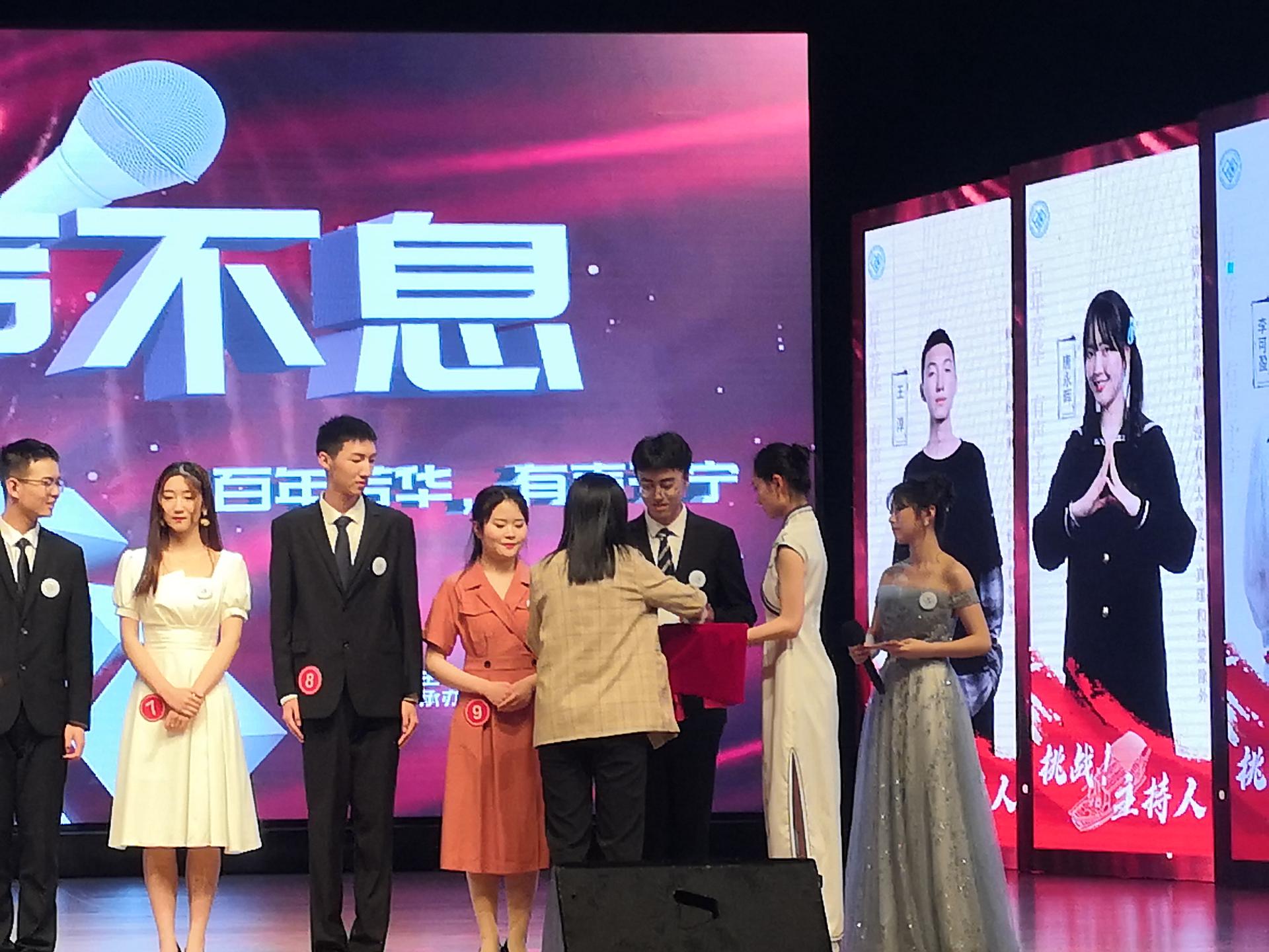 本次决赛采用两轮赛制。第一轮为主持展示环节,在第一个环节中公司机械类2006班班长鹿映钦同学与搭档合作表演了南工大版“青年大学习”主持节目,其独特的表演形式及大气稳重的台风获得了评委们的肯定与表扬,第二轮为即兴情景主持,重点考察各位选手即兴主持和灵活应变能力,鹿映钦同学面对随机的主持选题,他沉着冷静,在即兴主持中用充足的准备和沉稳的状态表现突出。最终从十位参赛选手脱颖而出。斩获本届“挑战主持人”大赛第三名,获得铜话筒奖杯。