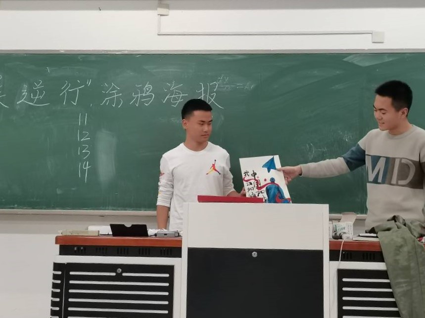 活动共分为三个环节。首先,参赛人员两两分组,合作制作涂鸦海报。其中,新能2001蒋谨和孙阔同学的涂鸦海报最为新奇美观,从众多作品中脱颖而出。第一环节结束,各参赛人员依次上前介绍作品内涵,各评委和观众选定暗自心仪作品,开始投票。投票结束,来自新能2001的蒋谨和孙阔同学获得一等奖,二等奖被机械2003的江梦奇、陆成彦和机械2001的叶子骏、葛潇雨同学获得。万江玲与王可心小组和石书航与沈佳庆小组获得三等奖。