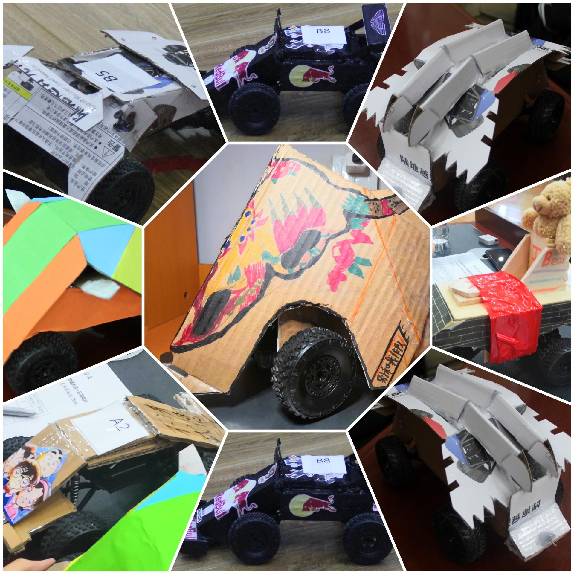 本次DIY小车比赛,要求参赛队伍在统一提供的小车动力底盘的基础上自行设计外壳,通过扎破气球以及距离场地中心距离评分。比赛开始,各组参赛人员代表详细介绍了自己的小车制作过程以及制作理念。同学们分别结合了工程制图,数学几何,艺术美感等知识,介绍了测画图纸、制作零件、组装美化的过程。经过初赛、复赛、决赛三个环节,决出了比赛的一二三等奖。