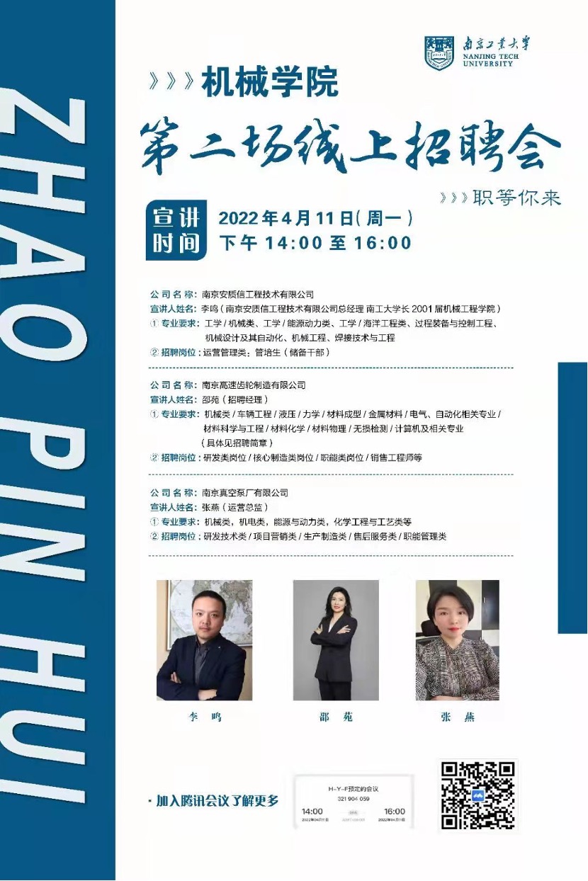本次招聘会严格按照疫情防控工作要求,依托互联网优势,邀请到了南京高速齿轮制造有限公司、南京安质信工程技术有限公司、南京真空泵厂有限公司三家国内外驰名公司的宣讲人,企业也提供了超百个岗位需求。宣讲人从多个角度介绍了企业基本情况、成就、企业文化、招聘岗位、薪资、福利、企业特色等内容。