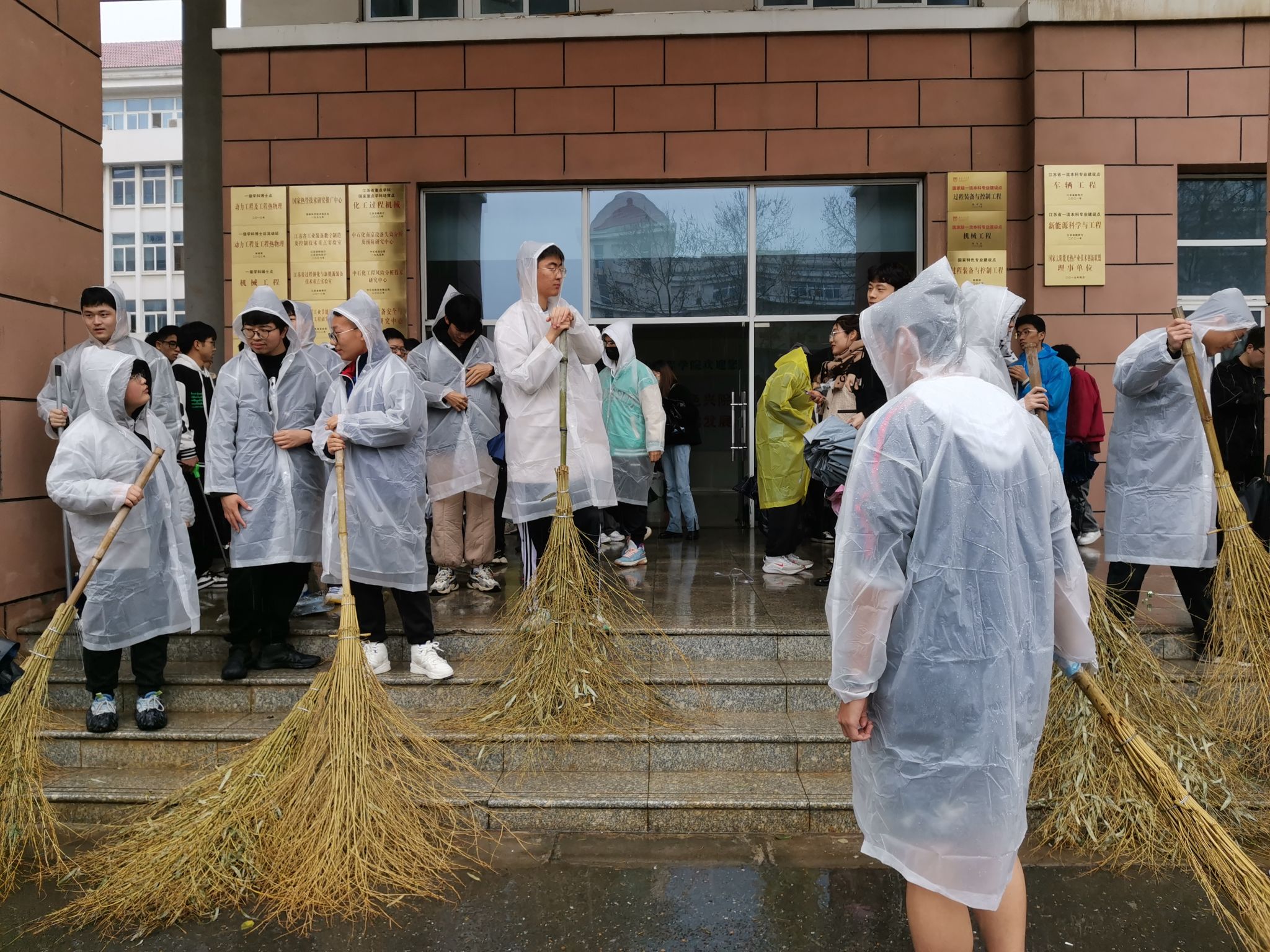 本次活动旨在弘扬爱卫新风尚,开展公司周边环境卫生治理、落实生活垃圾分类以及提高同学们的卫生安全意识。为了保证清扫工作的有序开展,活动活动开始前,公司将志愿服务的师生们编成小组,交待各组负责区域和清扫要求。活动当天,老师们带领着每组成员,有序领用清扫工具和雨衣,分工清晰,通力合作。淅淅细雨浇不灭大家的爱卫志愿服务热情,他们身披雨衣,手持工具,细致的清扫崇德学科楼区域内的地面、卫生死角,所到之处皆焕然一新。