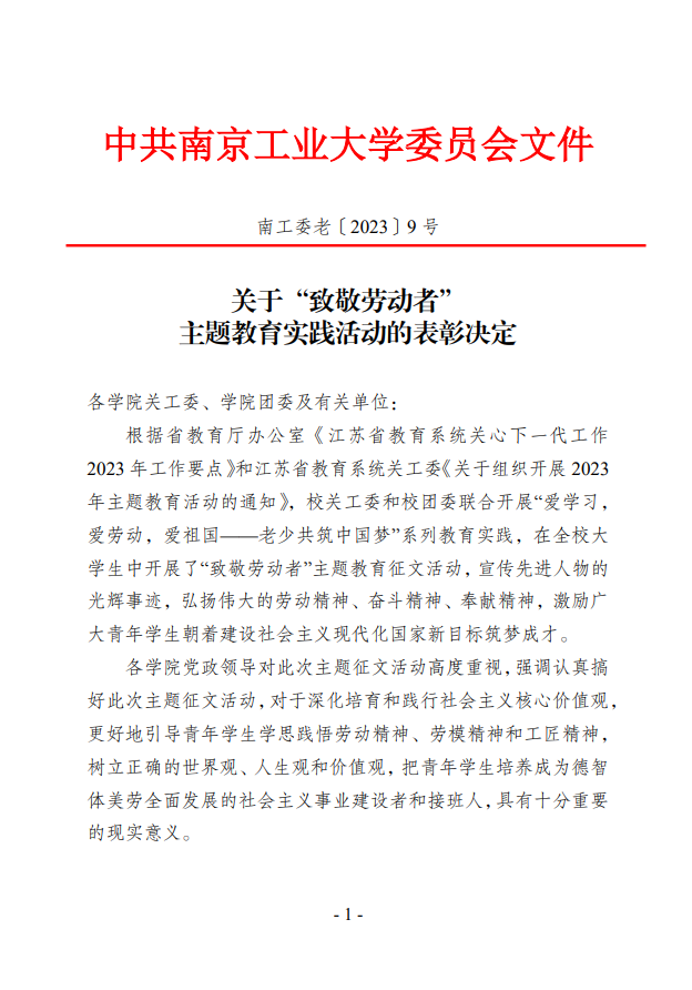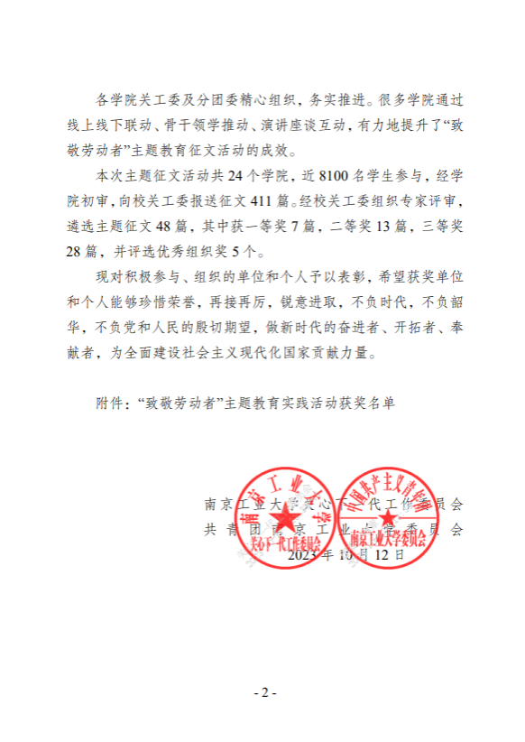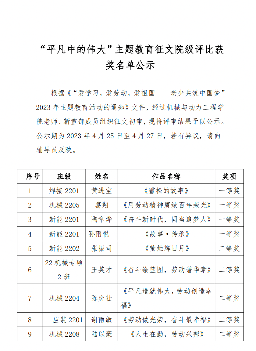 为深入学习贯彻党的二十大精神,根据省教育厅办公室印发的《江苏省教育系统关心下一代工作2023年工作要点》和省教育系统关工委印发的《关于组织开展2023年主题教育活动的通知》要求,校关工委和校团委联合开展“致敬劳动者”主题教育征文活动,在本次活动公司中新能2101班卜天棨荣获一等奖,过装2102高云涛、过装2203葛翔荣获二等奖,新能2202杨子睿荣获三等奖,公司也因组织工作出色荣获优秀组织奖。