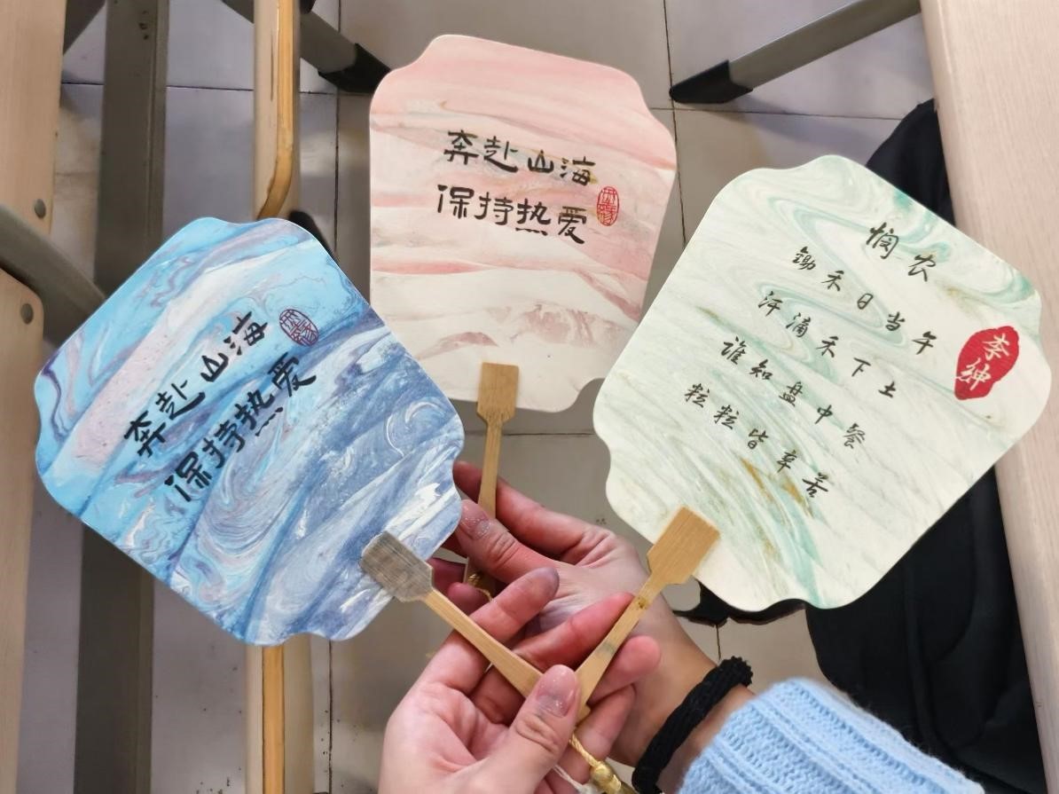 本次系列活动涵盖了非遗文化展示与创作体验等环节。非遗文化展示环节让同学们深入了解了漆扇的历史,并近距离接触到了漆扇制作这一传统非遗技艺,同学们欣赏了精美的漆扇作品,更感受到传统文化的深厚底蕴。在创作体验环节,同学们亲身体验了漆扇制作工艺的过程,经过调色、绘制、浸染等环节,大家都完成了自己的漆扇作品。