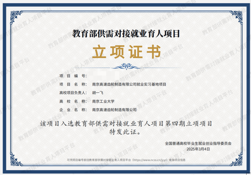 近日,教育部高校员工司公布了第四期供需对接就业育人项目立项名单。由公司胡一飞老师牵头申报,付昌义、张旭、杨群等教师共同参与的《南京高速齿轮制造有限公司就业实习基地建设项目》成功获批立项。该项目将获得合作企业提供的实践岗位、定向培养资金等支持,标志着公司在深化产教融合、创新校企协同育人模式方面取得新突破。