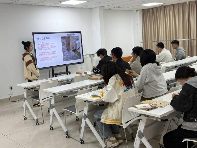 活动首先介绍了榫卯结构的历史渊源及其在现代机械设计中的应用,深化了同学们对传统技艺的认知。之后同学们通过亲手拆解、组装榫卯构件,不仅让同学们对机械设计的公差配合有了更直观的理解,同时,也深刻体会到“不用一钉一铆”的东方智慧,增强了对非遗技艺的保护意识。