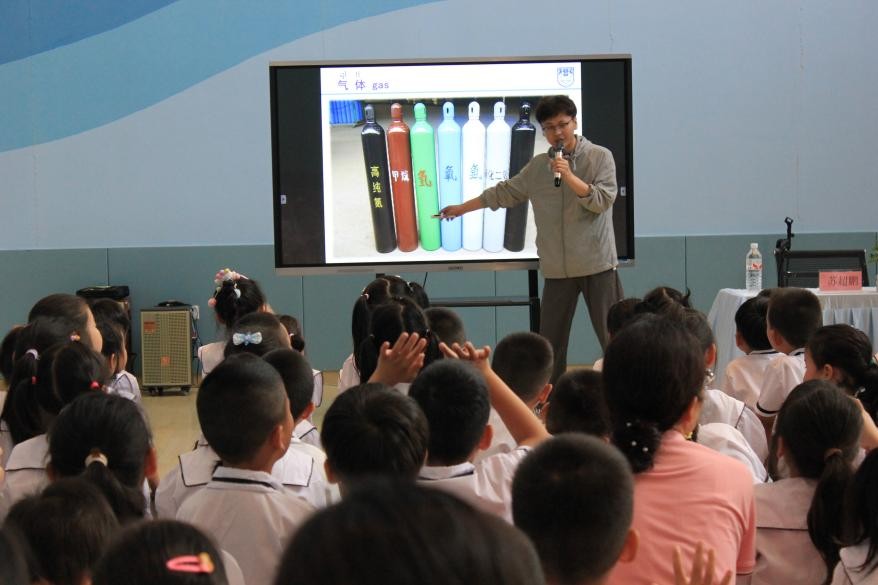 在演讲的开始苏超朋通过生动的轮船浮在水上吸引了孩子们的注意力,随后又通过飞机升空的例子进一步激发了他们的兴趣,由此引出流体的概念。为了让孩子们更好地理解流体,苏超朋再次介绍了生活中常见的固体以及无处不在的气体,随后深入浅出地讲解了液体和气体以及固体的特点。紧接着,通过有趣的实验和图示,向孩子们展示了固体、液体和气体之间的转换关系。