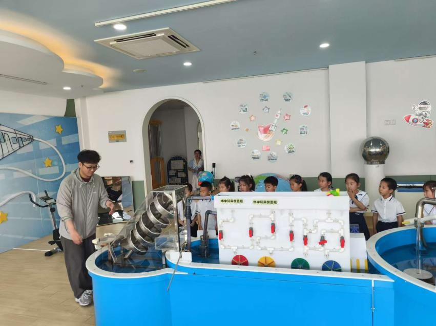 讲座结束后苏学长再次带领部分孩子去幼儿园的科技馆对水利发电的原理进行讲解,进一步解释流体的作用。讲解期间孩子们踊跃提问,积极探索知识。