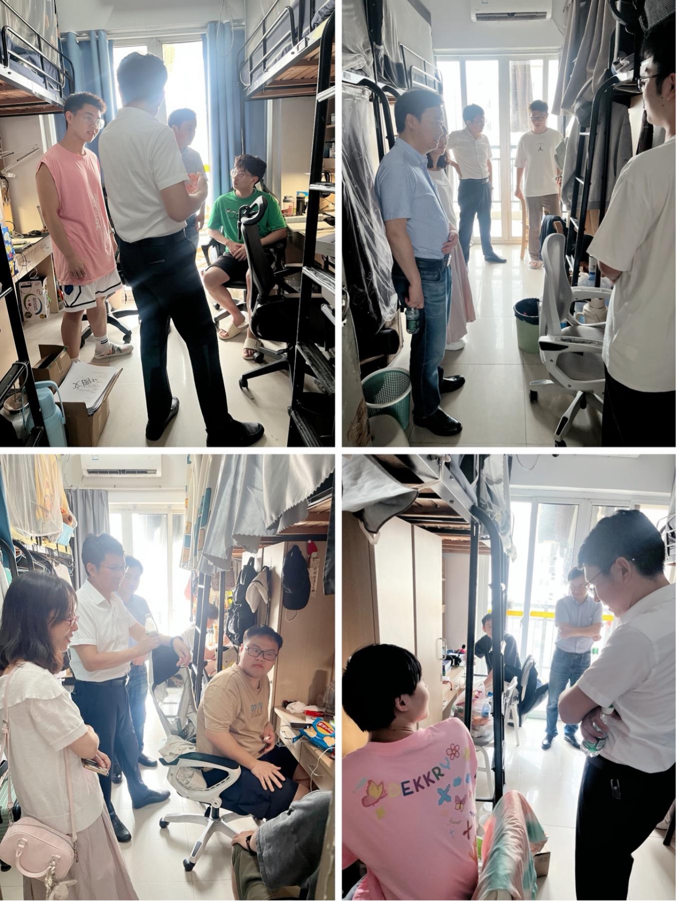走访过程中,公司领导们走进员工宿舍,与留校同学进行了亲切交流。蒋远喜书记详细询问了同学们暑期留校的学习安排、生活状况,嘱咐在校员工务必注意安全,并嘱咐在校员工干部、员工党员肩负起所在班级的安全责任,发挥先锋模范作用。付昌义询问同学们遇到的困难,并对同学们不畏酷暑、坚持学习和科研的精神表示赞赏。辅导员老师们鼓励大家合理安排时间,劳逸结合,注意防暑降温与安全。同学们对公司领导及老师们的关心表示感谢,现场气氛温馨融洽。