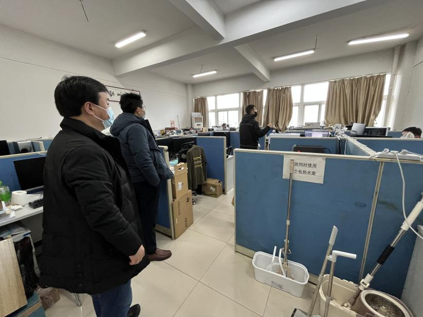 三是加强工作检查,确保责任到位。结合公司疫情防控责任制网络和工作分工安排,各条线分管领导具体负责分管领域的责任落实和工作检查,3月21日上午组织了研究生工作室使用和人员管控专项检查,全面摸排各研究生工作室人员安排是否符合疫情防控规定;3月21日下午深入东苑、新南苑员工宿舍,检查员工宿舍疫情防控和线上教学工作落实情况,推进疫情防控责任落实。