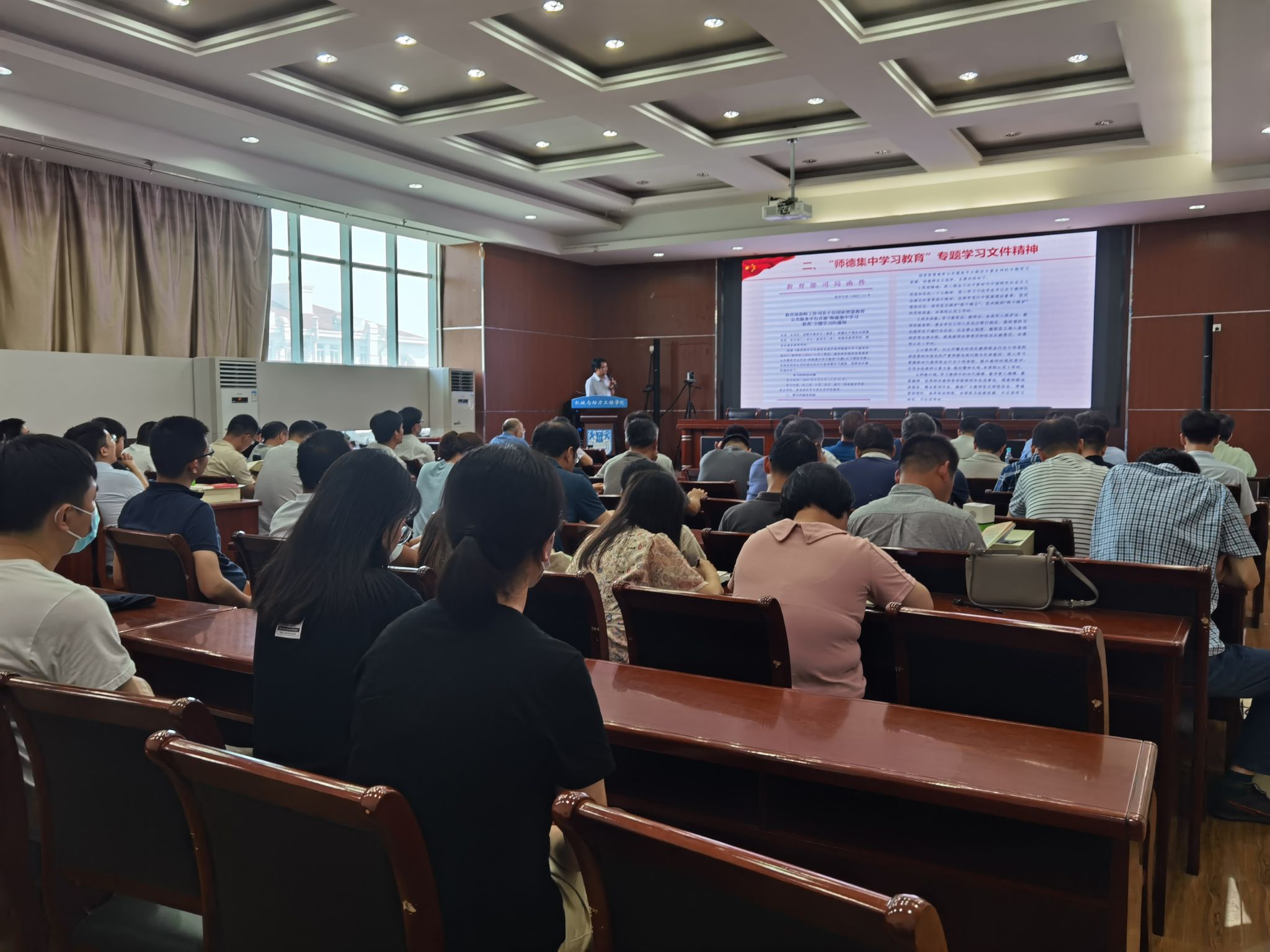师德集中学习教育环节举行了公司新入职教师入职仪式,并向新教师赠送了《纪念戴树和先生诞辰100周年文集》和纪念品。校第十五届“师德十佳”周剑锋教授作为教师先进典型代表发言,分享了自己立足教书育人本职、上好每一堂课、教好每一个员工的感悟和体会;青年教师王旭东副教授作为新入职教师代表发言,表示将坚决落实立德树人根本任务,争做“四有”好老师。随后,蒋远喜书记传达了教育部、教育厅、公司关于开展“师德集中学习教育”的通知文件精神,并就相关工作进行了布置。最后,蒋远喜书记就学习贯彻习近平总书记关于教师队伍建设的重要论述、《新时代教师职业行为十项准则》、师德失范行为处理办法等法律法规、师德警示教育案例等进行了集中宣讲,号召全体教师牢记习近平总书记嘱托,坚定理想信念、陶冶道德情操、涵养扎实学识、勤修仁爱之心,树立“躬耕教坛、强国有我”的志向和抱负,坚守三尺讲台,潜心教书育人,争做为学、为事、为人的大先生。