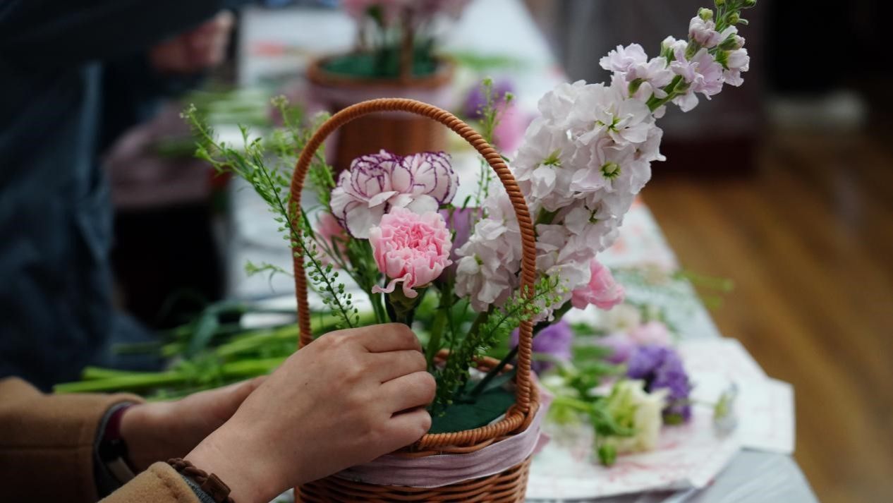在专业老师的指导下,女教师们开启了一段创意美的探究之旅。活动中,专业老师向大家讲解了插花工艺的创意搭配和创作流程,女教师们面对着一束鲜花、一个花篮,一把剪刀,跃跃欲试。鲜花品种多样,包括玫瑰、郁金香、康乃馨、紫罗兰、洋桔梗等,女教师们在体验插花的过程中增强了对创意美的感受和认知,收获颇丰。