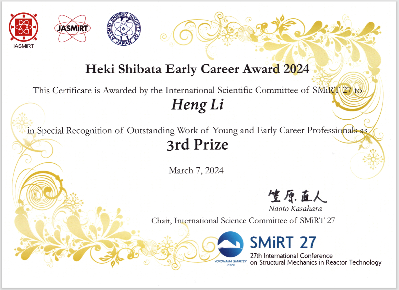 SMiRT 27国际科学委员会主席、东京大学N.Kasahara教授为李恒博士后颁发证书